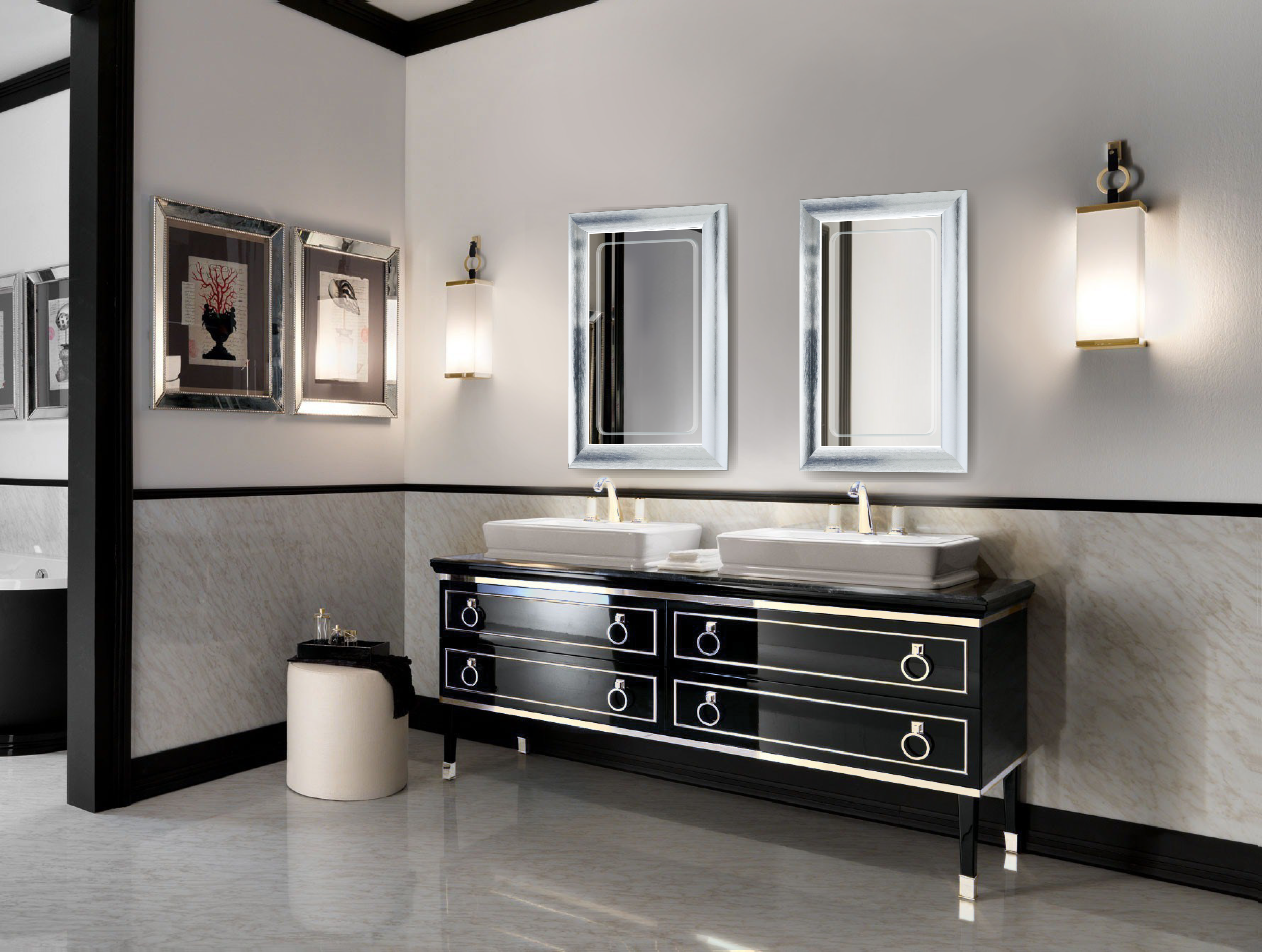 If your bathroom contains classic elements, like a claw foot tub, or carved cabinetry we recommend a framed LED mirror. The framed LED mirror, we offer in gold and silver, comes in three sizes: 24″x36″ LED mirror, 48″x30″ LED mirror, and 60″x30″ LED mirror. The frame may be painted to suit your space; LED mirrors are easily customizable with your contractor. We’ve seen red lacquer frames to suit modern, bold palettes.